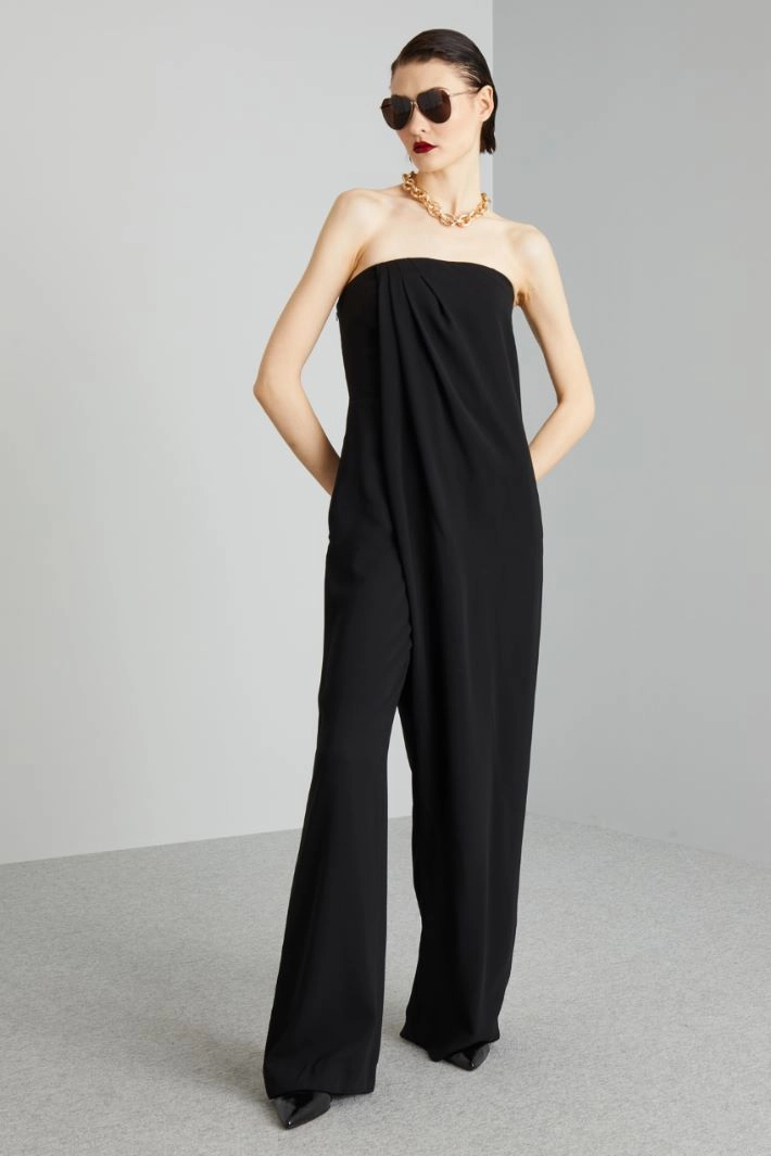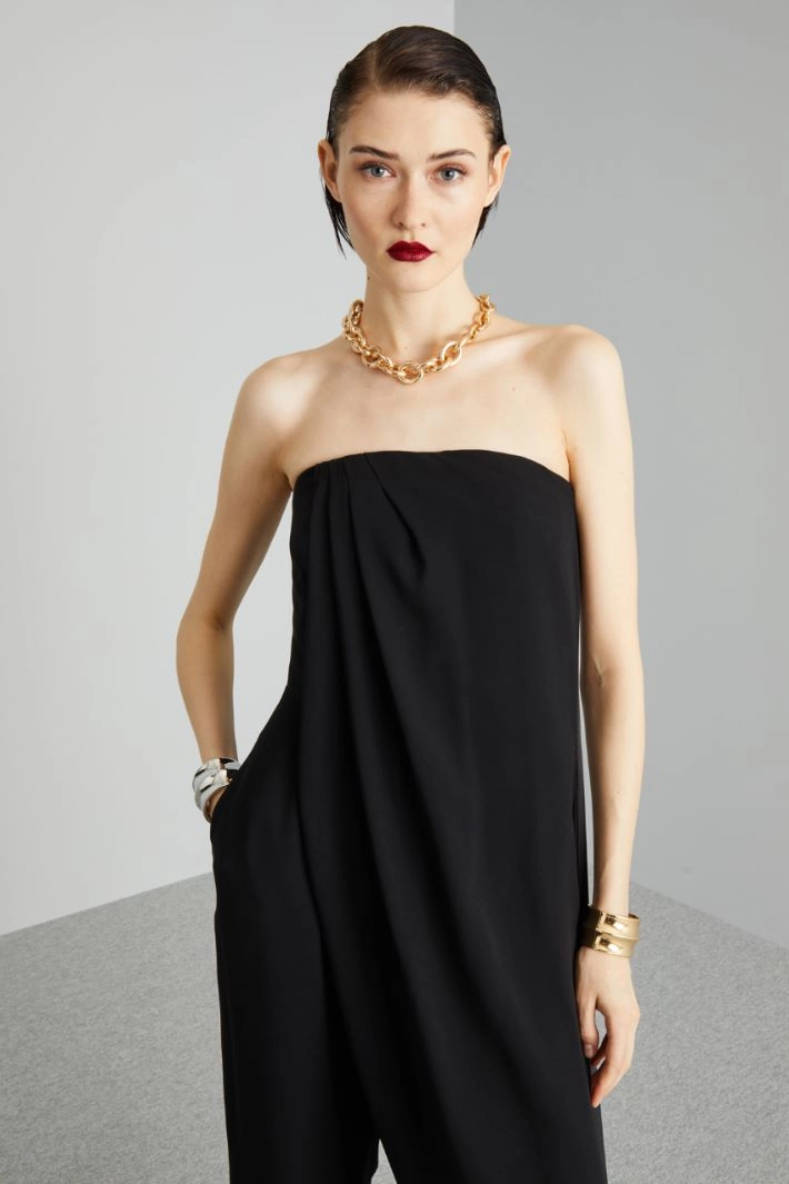 Loose fit cady bustier jumpsuit with crossed wrap panel, off-shoulder neckline, inset side pockets on the hips, satin side bands and invisible zip and hook fastening on the side. Partially-lined.
