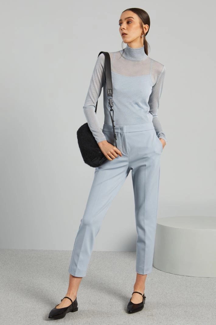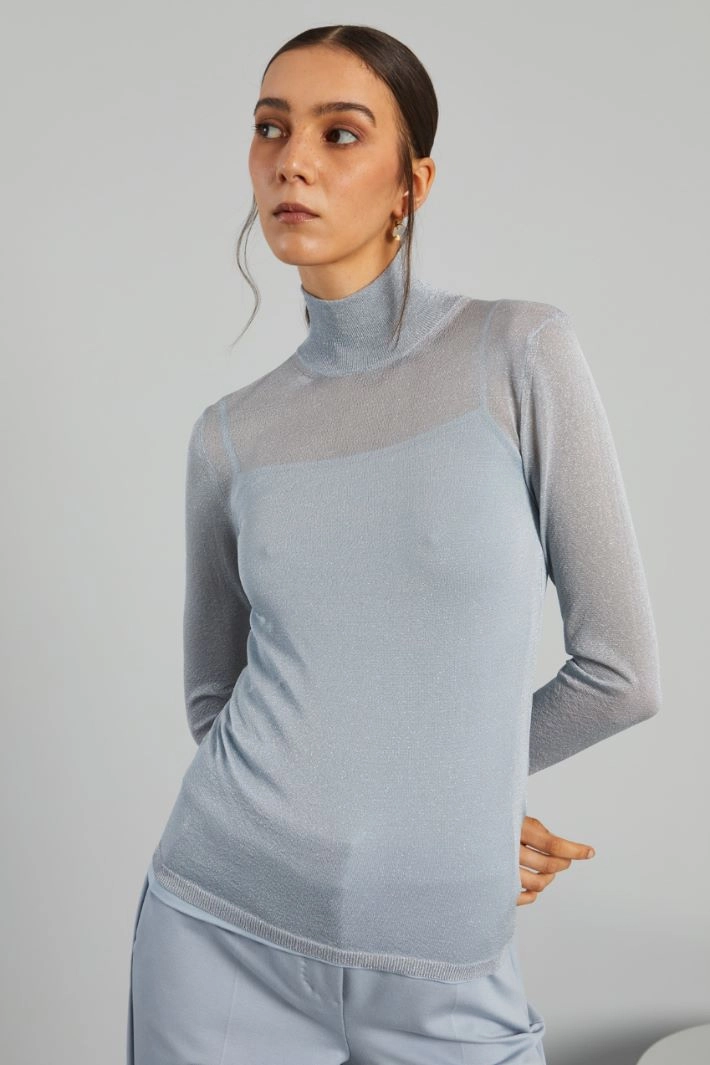 Slim-fit sweater in viscose blend yarn with lamé fiber insert, high neck with zip on the back, long sleeves and ribbed profiles. Matching slip top.