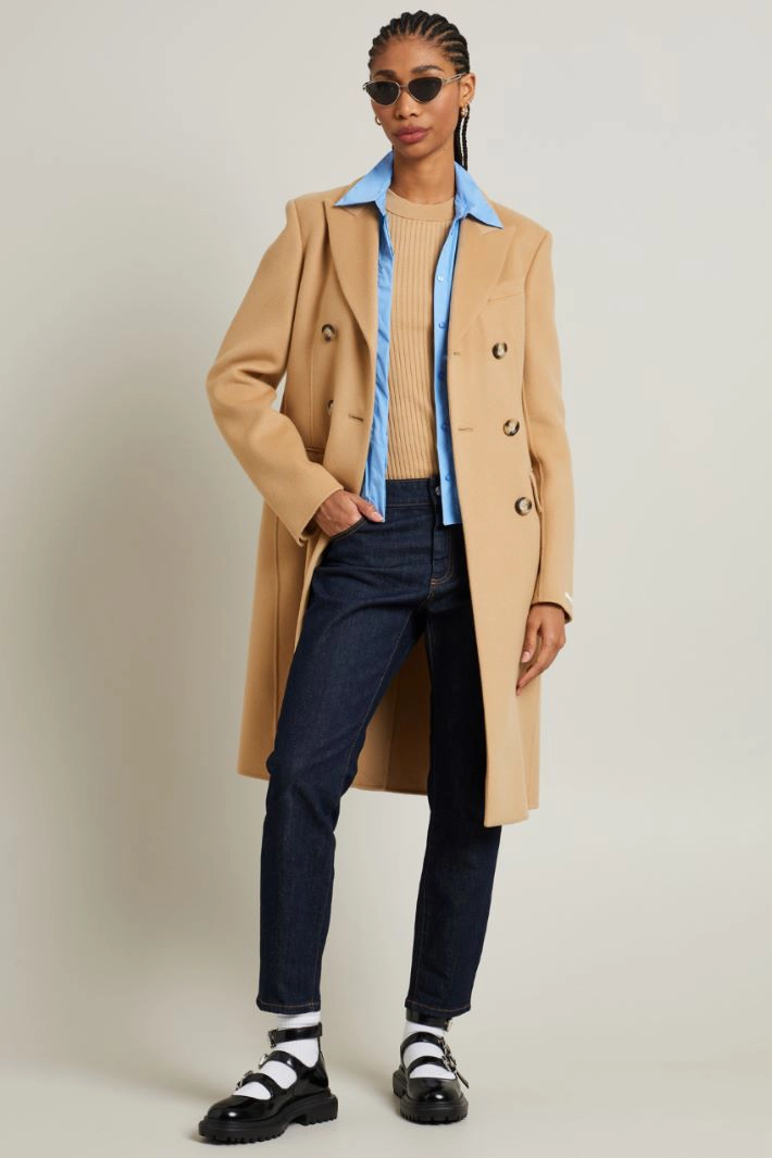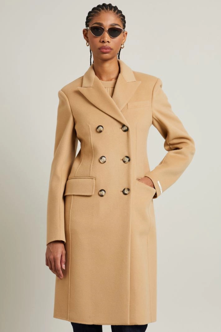 Fitted coat in double pure wool drap, with lapel collar, long sleeves with buttons, double welt side pockets with flap and central vent on the back. Double-breasted fastening with buttons. Semi-lined.