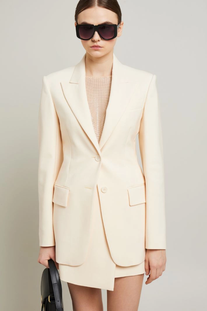 Long fitted blazer in double wool stretch canvas with peak lapel, long sleeves with buttons, padded shoulders, welt chest pocket and double welt side pockets with flap, single-breasted button fastening and overlapping back vent. Lined.