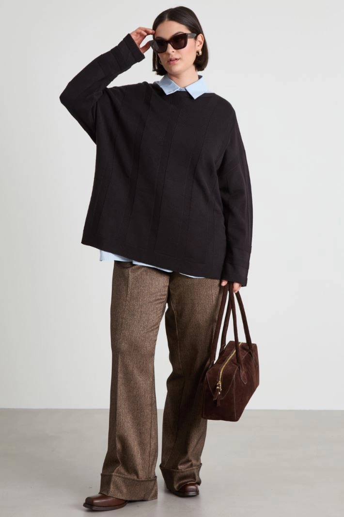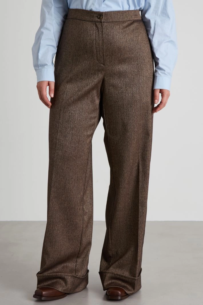 Straight-cut trousers in stretch viscose blend chevron, with elastic waistband insert on the back, French pockets, pressed crease lengthwise and turn-up at the hem. Zip and button fastening.