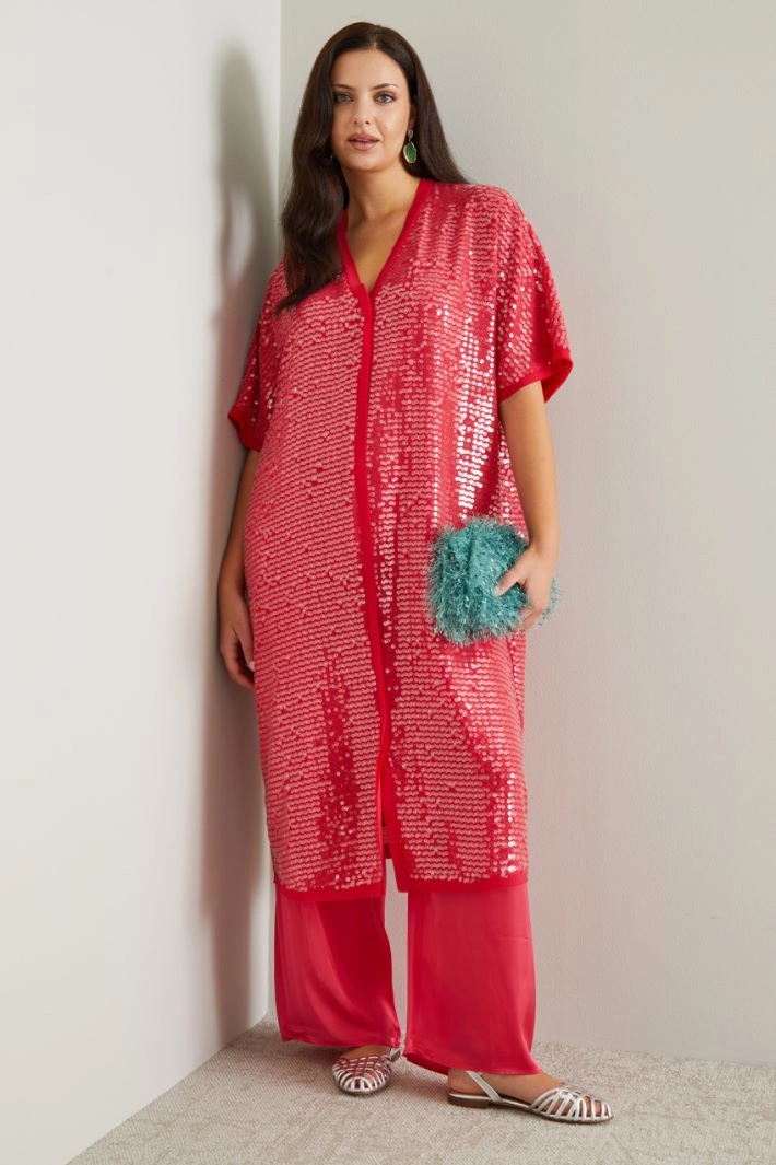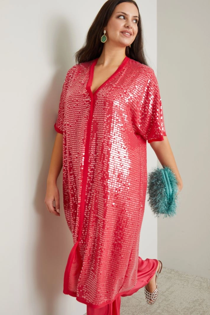 Straight-fit longuette dress in sequined georgette, with a V-neck, short kimono sleeves and a central slit on the front. Lined.