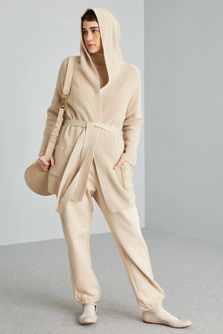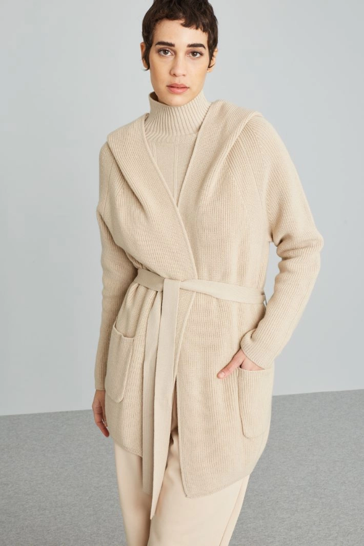 Long, loose fit, ribbed jacket in pure wool yarn, with hood, long raglan sleeves, side patch pockets and fastening with a matching belt.