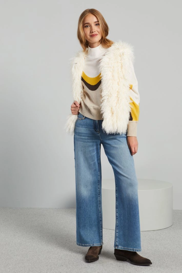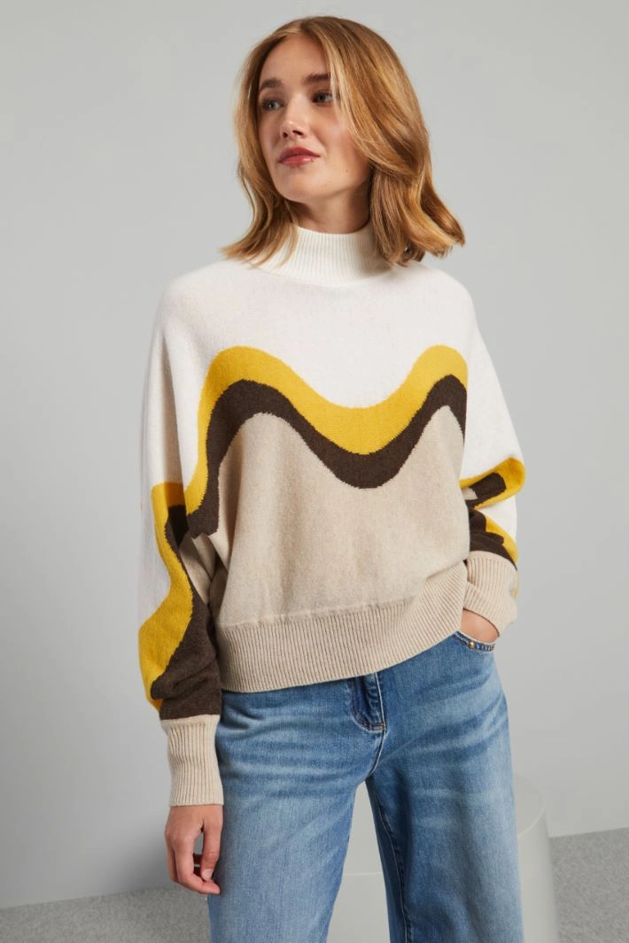 Loose-fit sweater in pure wool yarn with inlay motif, crater collar, long kimono sleeves and ribbed profiles.