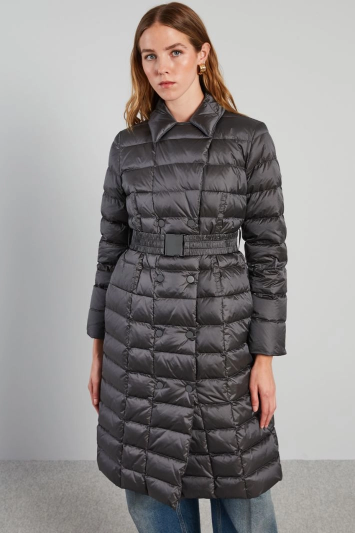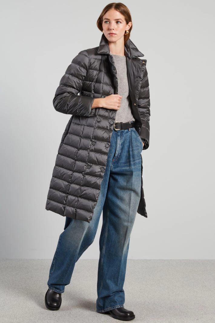 Flared down jacket in quilted technical canvas, with a shirt collar finished in corduroy, long sleeves with elastic insert at the cuff, side welt pockets and double-breasted fastening with press studs. Elastic waistband with matching snap buckle.