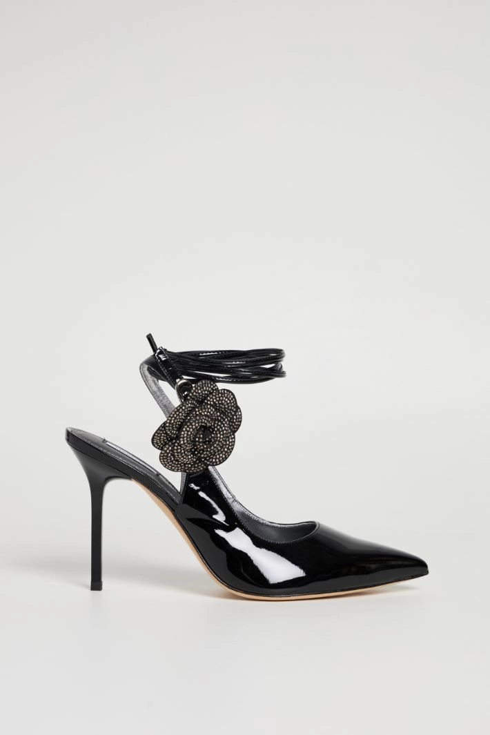 Slingback in genuine patent leather, with pointed toe, thin heel, adjustable buckle strap, lace and removable rhinestone flower. Leather sole.