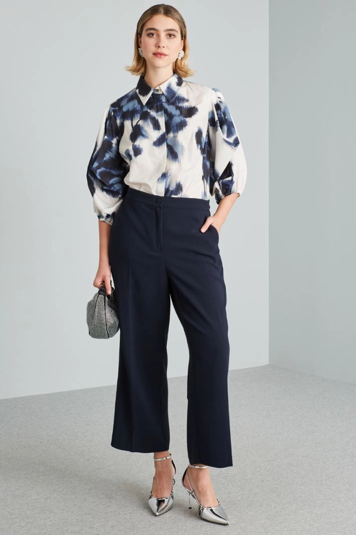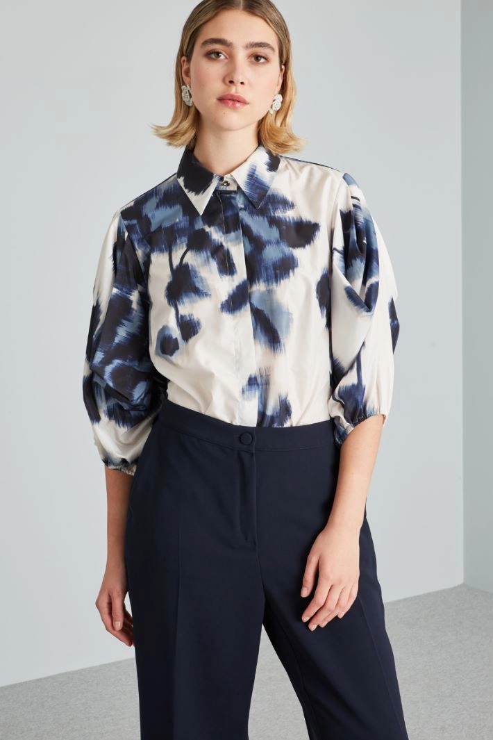 Straight-cut tunic in printed taffeta, with shirt collar, three-quarter puff sleeves with sewn pleats on the shoulder and elastic insert at the hem, hidden fastening with buttons.