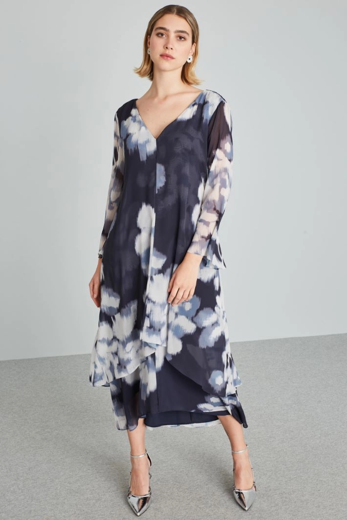 Fluid dress in printed chiffon, with V-neck on the front and back, long sleeves, asymmetrical ruffle motif at the hem and invisible zip fastening on the back. Partially-lined garment.