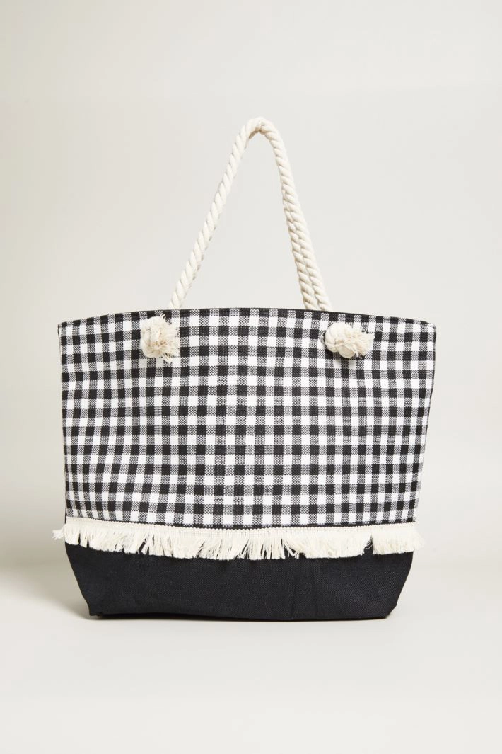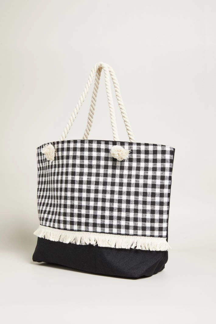 Canvas shopper bag with yarn-dyed vichy insert on the front, double torchon handles, fringed trimmings and lined interior with pocket. Zip closure.