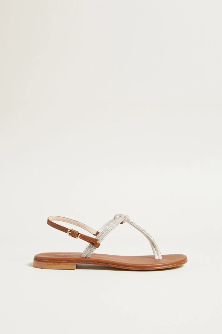 Faux leather sandals with rhinestone details and strap closure. Leather sole.