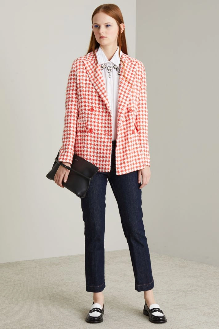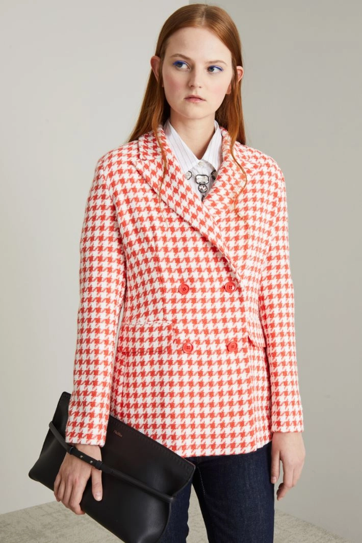 Straight-cut tweed blazer with lapel collar and long sleeves. Flap pockets. Double-breasted fastening with buttons.