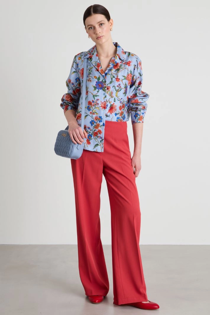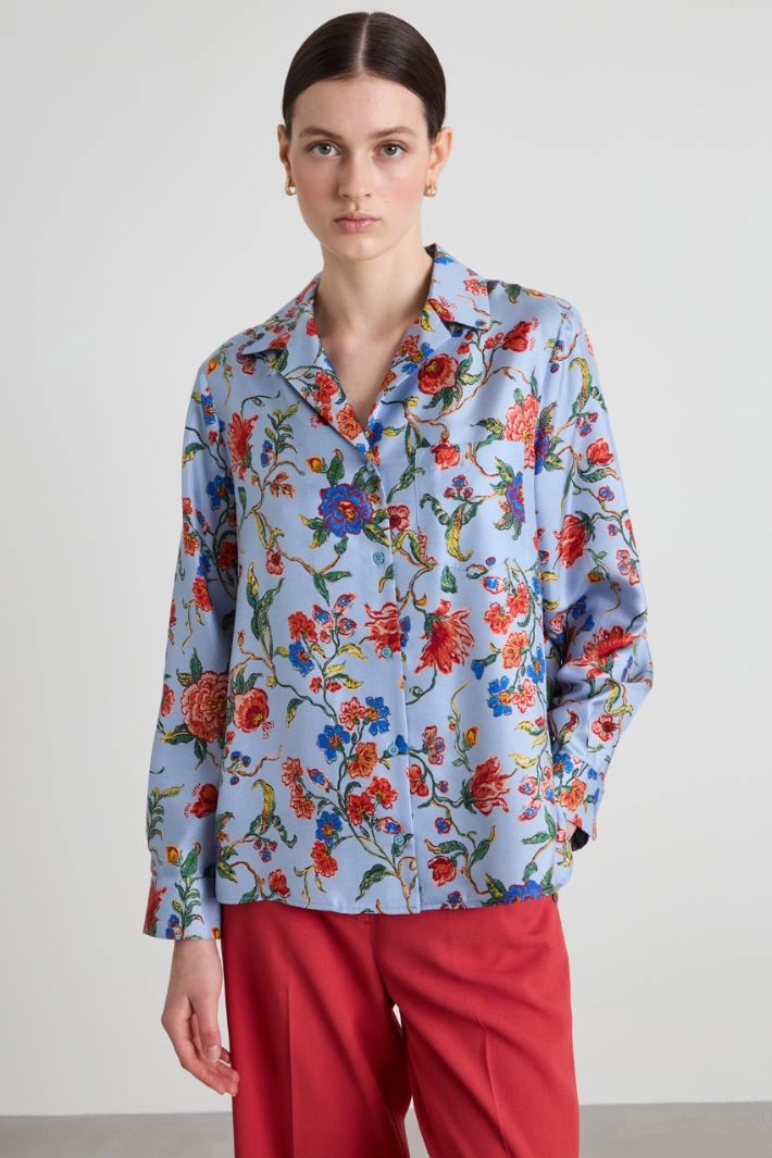 Straight-cut pajama-style blouse in pure silk twill with an all-over printed motif, lapel collar, breast pocket, long sleeves with cuff and button. Fastening with mother-of-pearl buttons. Square hem with small side slits.