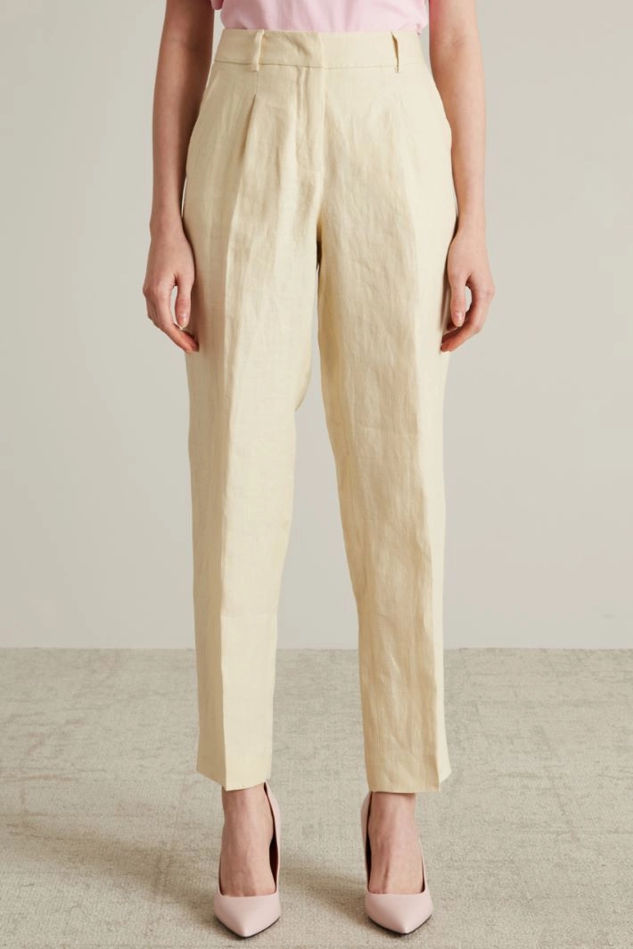 Straight-cut wool trousers with belt loops. French and welt pockets on the back. Zip and hook fastening.