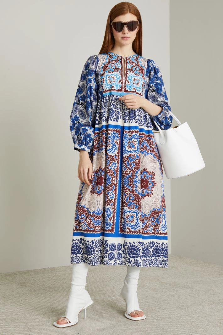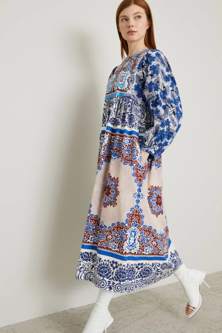 Oversized dress in printed pure cotton poplin, with round neckline finished with a teardrop opening with button, long sleeves with thin cuff and button, gathered waist and French side pockets. Partially-lined.
