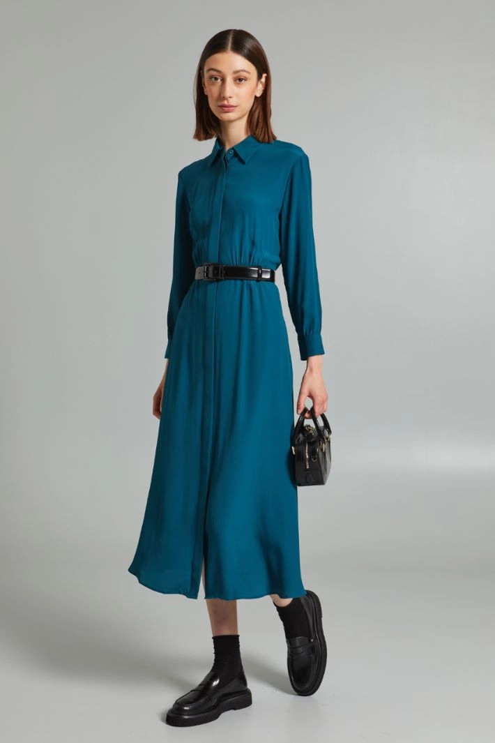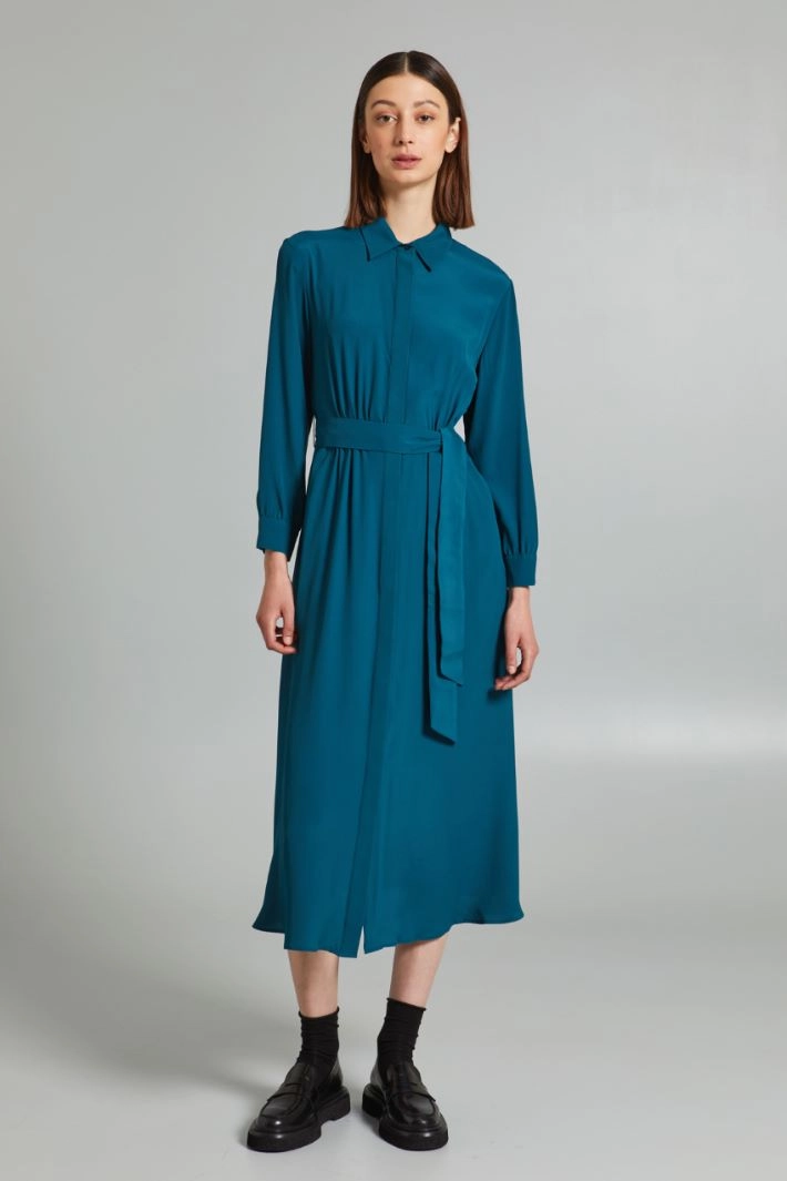 Long flowing shirt dress in silk blend crepe de chine, with classic collar, long sleeves with cuff and button, gathered waist, inset side pockets. Hidden button fastening and matching belt.