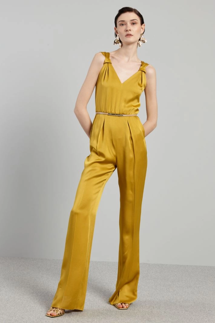 Long fluid jumpsuit in shiny viscose blend envers satin, with V-neck, shoulder straps with knotted motif, cut at the waist with stitched pleats and side French pockets. Invisible zip fastening on the back and thin patent leather belt with interlocking closure. Partially-lined.