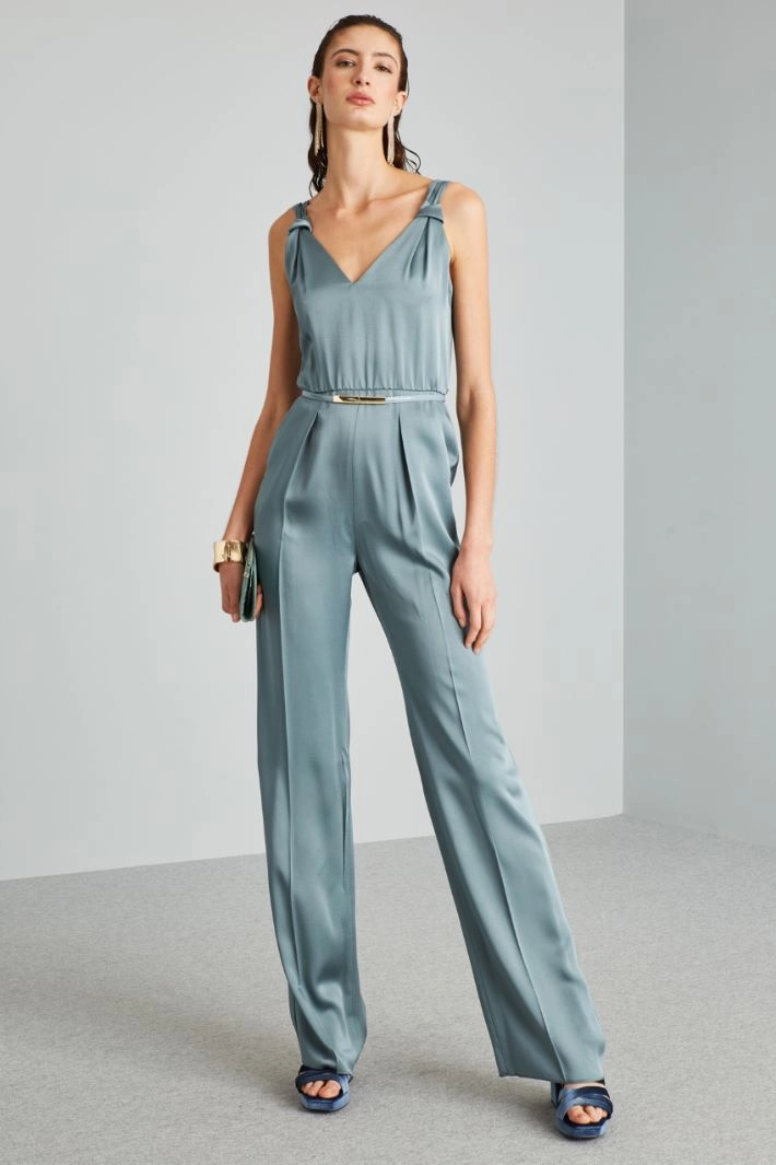 Long fluid jumpsuit in shiny viscose blend envers satin, with V-neck, shoulder straps with knotted motif, cut at the waist with stitched pleats and side French pockets. Invisible zip fastening on the back and thin patent leather belt with interlocking closure. Partially-lined.