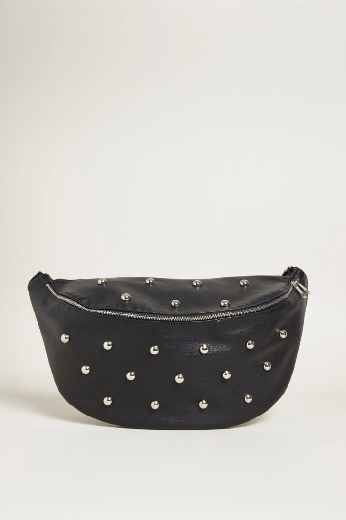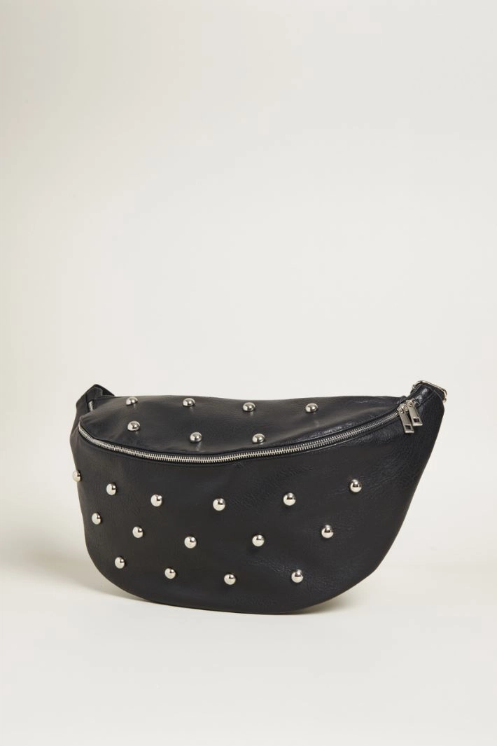 Maxi faux leather bum bag with studs, adjustable canvas shoulder strap. Lined interior with pocket. Zip closure.