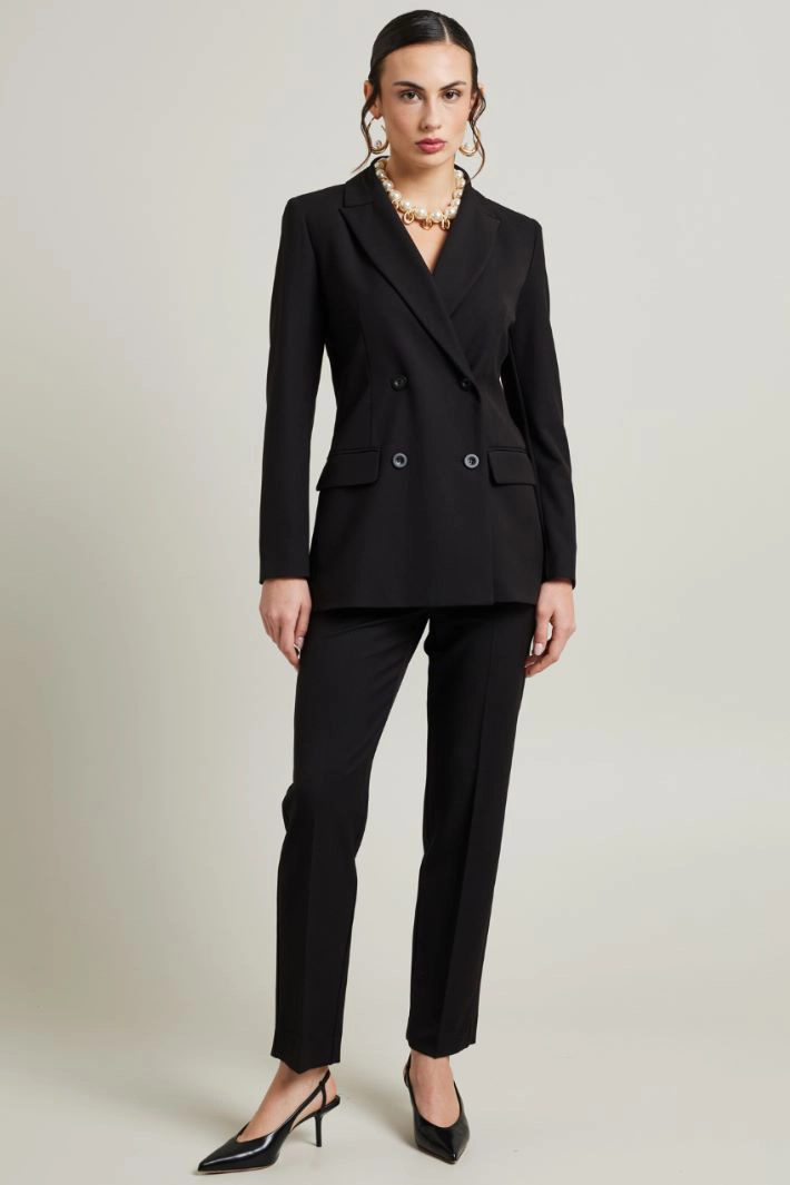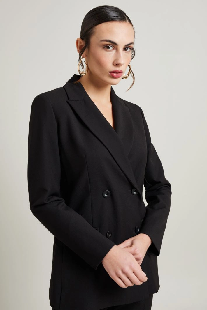 Slightly fitted blazer in stretch viscose blend gabardine, with lapel collar, long sleeves, double welt pockets with flap and double-breasted button fastening. Lined.