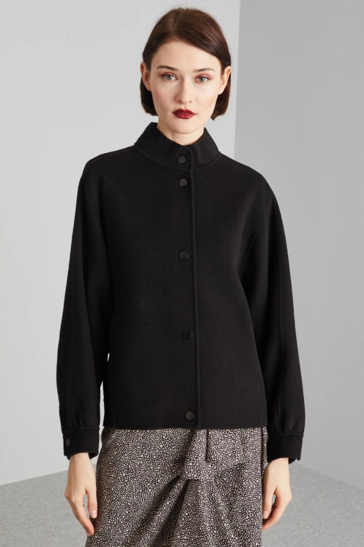 Straight-cut jacket in double wool blend cloth, with stand-up collar, long sleeves with cuff and button, inset side pockets. Single-breasted fastening with press studs. Unlined.
