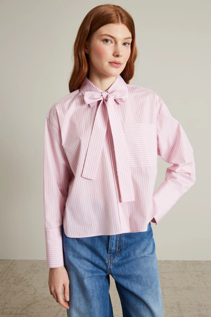 Boxy shirt in pure cotton poplin, with classic collar, long sleeves with maxi cuff and buttons, breast pocket and side slits at the bottom. Matching foulard.