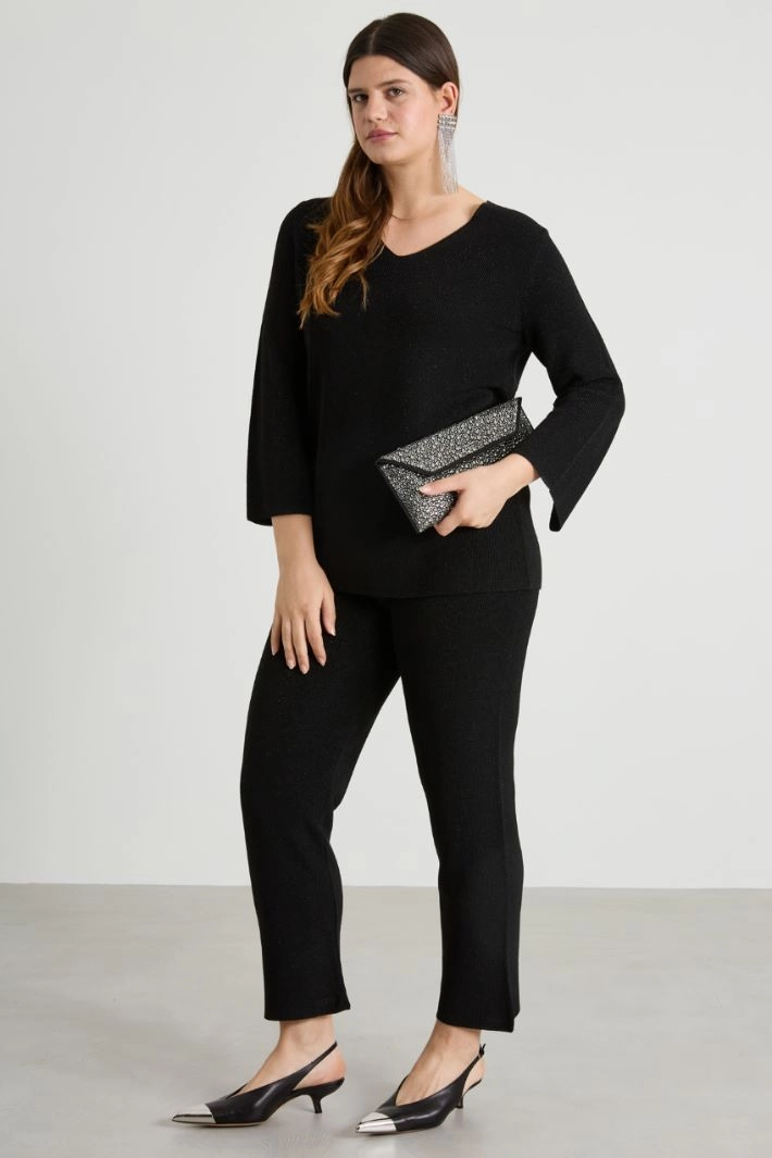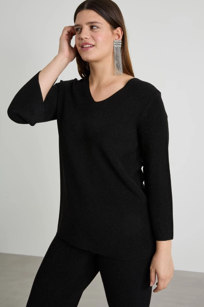 Straight-cut sweater in blend of viscose and wool lamé yarn, with a V-neck and long sleeves with side slits.