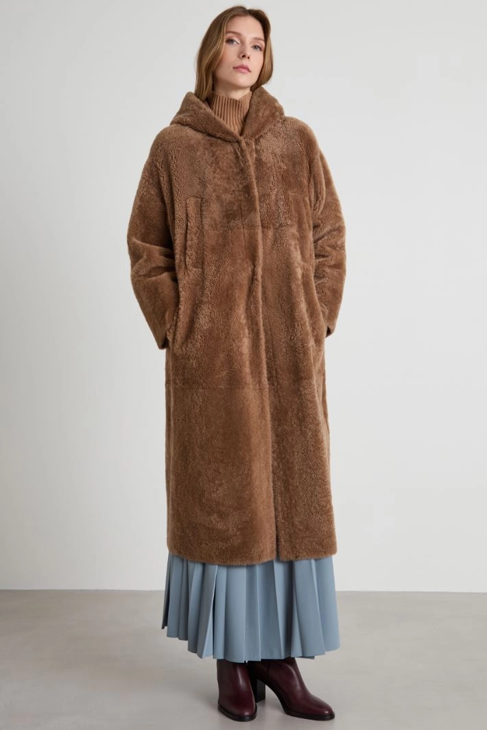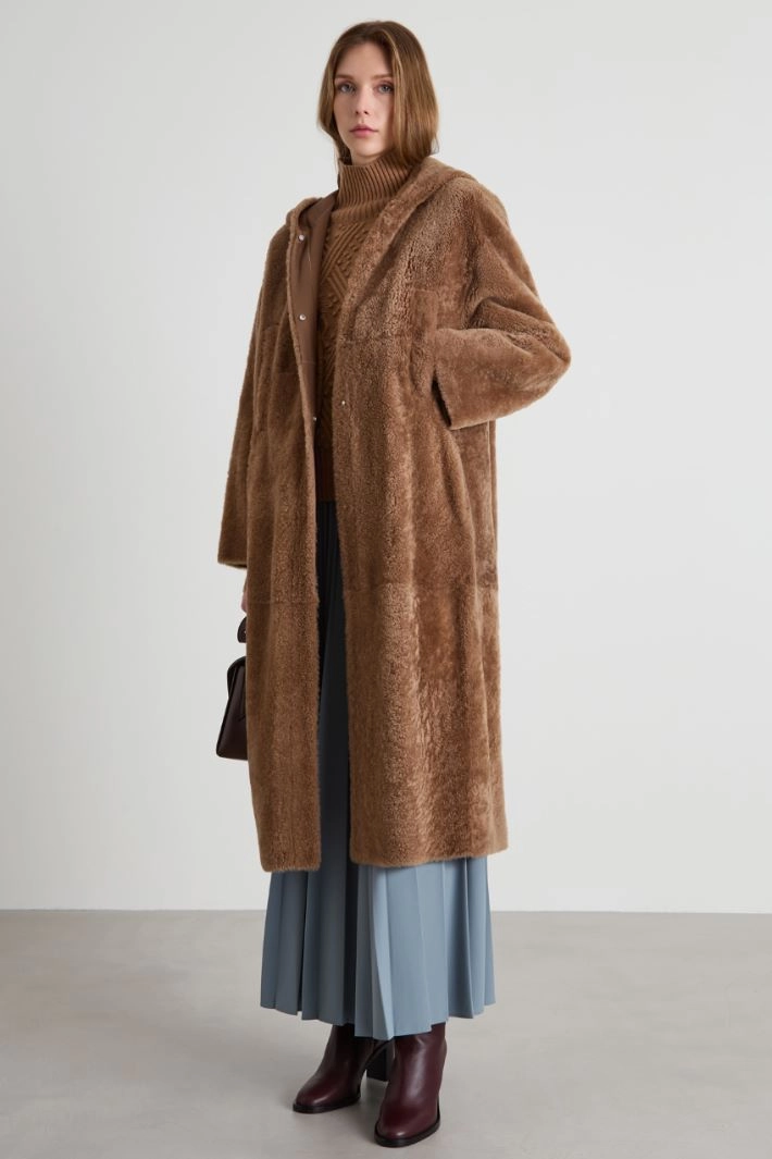 Loose-fit coat in sheepskin, with hood, long dropped sleeves and side welt pockets. Central slit on the back and hidden fastening with press studs.